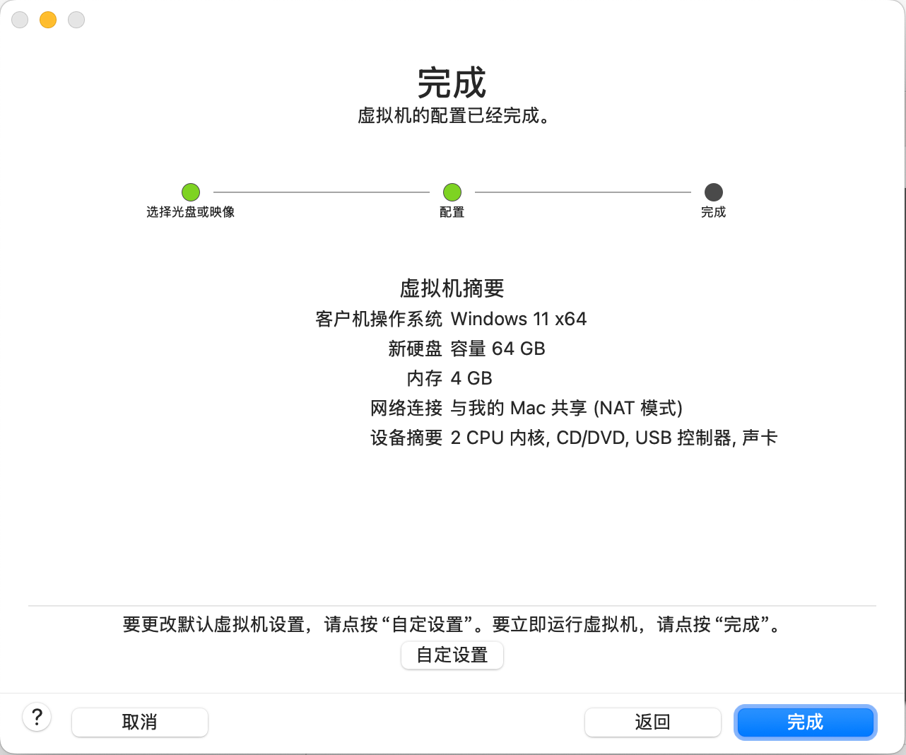 下图是我根据向导默认生成的虚拟机配置汇总,如果想要调整,可以继续点击自定设置按钮进行配置,最后点击完成按钮。