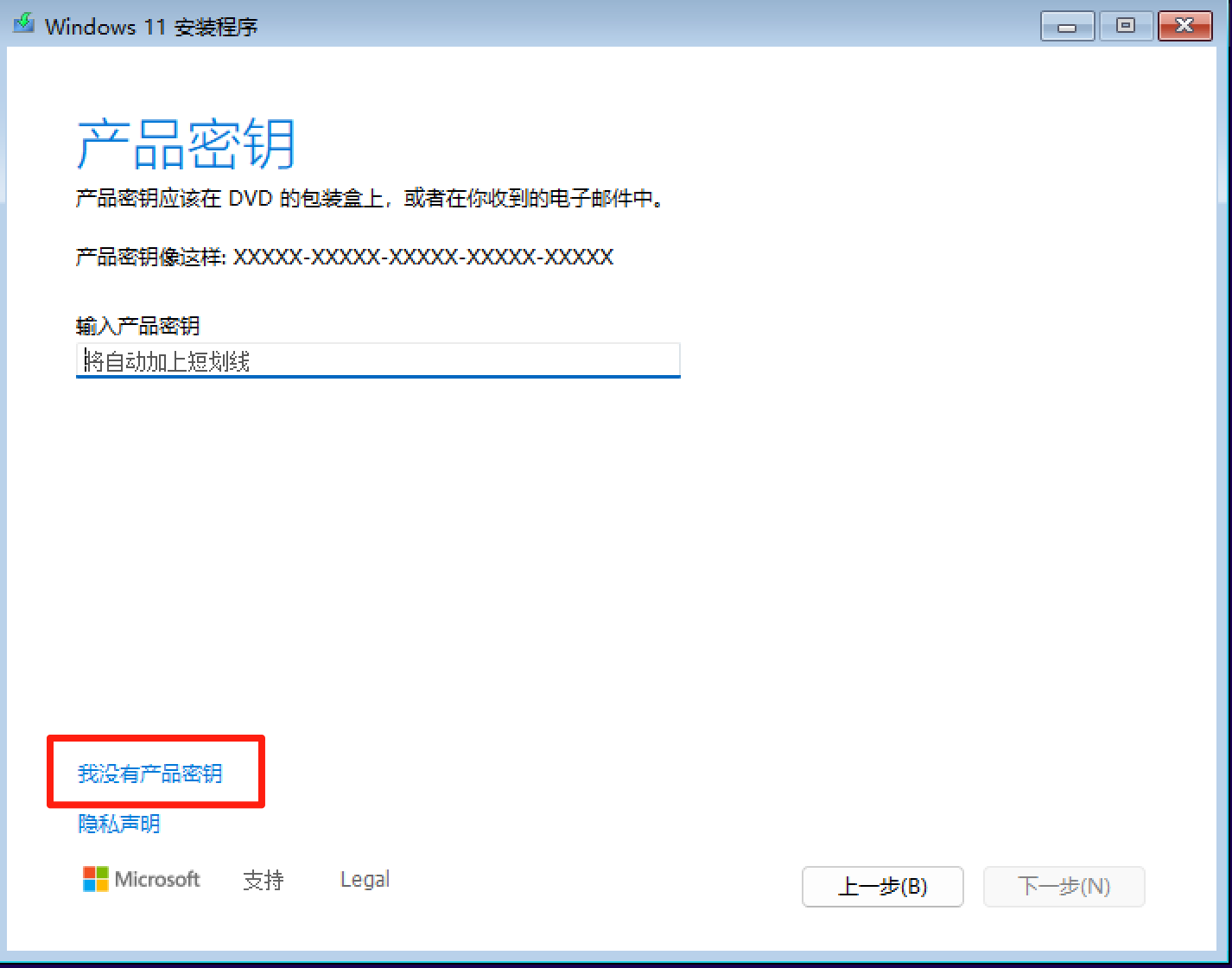 这个步骤比较重要,如果手上暂时没有可用的产品秘钥,就在左下角勾选我没有产品秘钥。