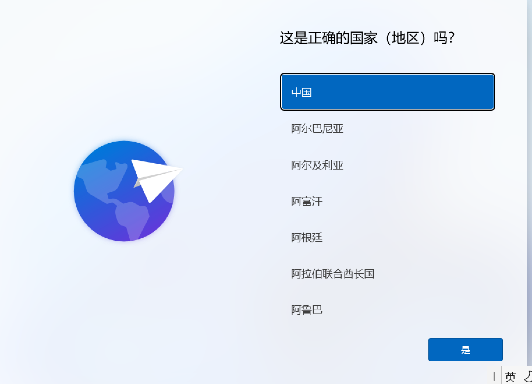 在安装完成之后就到了配置Windows 11的配置向导,首先弹出的国家(地区)的设置向导