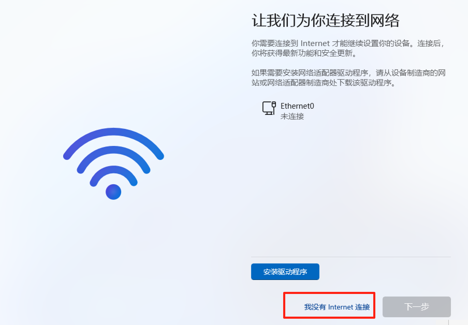 之后正常配置到网络连接步骤后,在此处要点击我没有 Internet 连接,之后就可以设置本地账号了!
